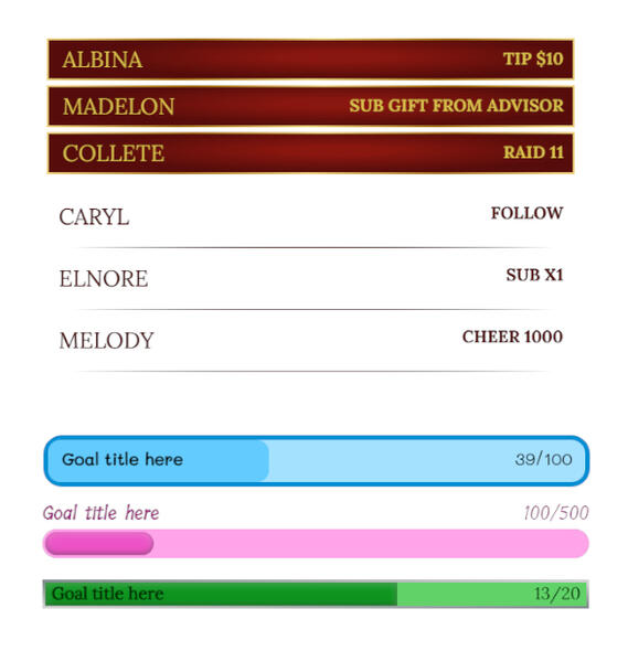 Do you want a chatbox, event list, goal bar or alerts for your stream, personalized to fit your aesthetic? Happy to help!I also have ready-made, customizable widgets up in my Ko-fi shop.